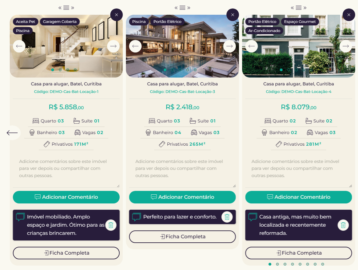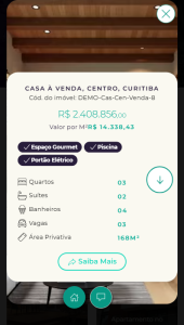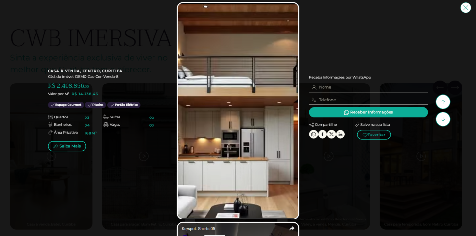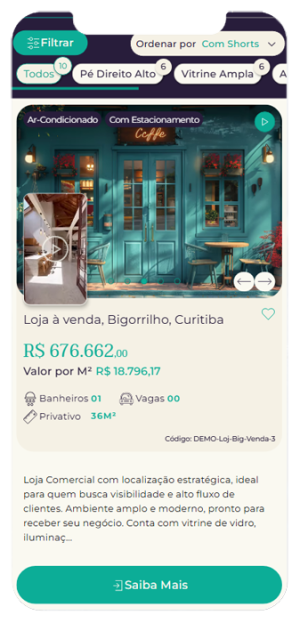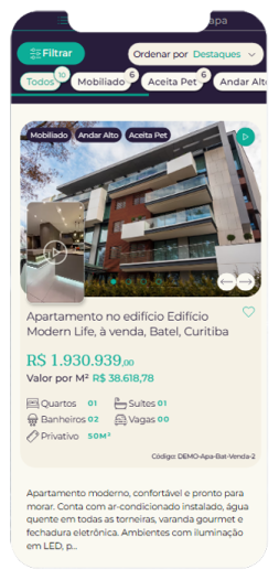 Vídeos curtos são o formato preferido nas redes sociais — e no site da sua imobiliária não é diferente. Com boas imagens e informações objetivas, seus clientes conseguem ver todos os detalhes de um imóvel em poucos segundos, sem precisar abrir várias páginas. Em apenas 3 minutos, é possível explorar diversos imóveis de forma rápida, prática e envolvente. Mais agilidade, mais interesse, mais chances de conversão.
