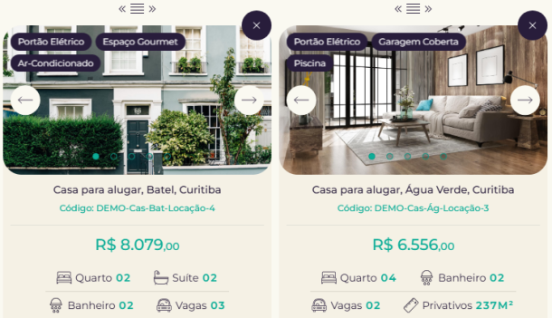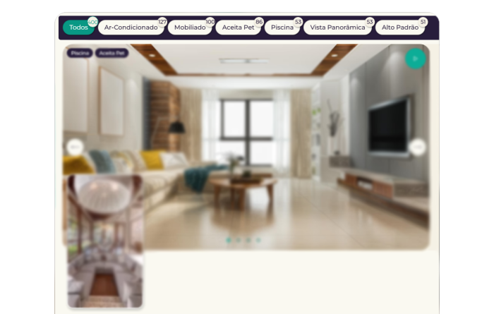 Além do filtro principal, a página de resultados oferece tags personalizáveis para refinar ainda mais a busca. Seus clientes podem filtrar imóveis por atributos como "Com Piscina", "Aceita Pet", entre outros. O melhor é que essas tags são totalmente personalizáveis.