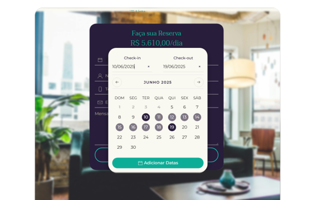 Ofereça uma experiência completa para seus clientes, seja para compra, locação anual ou de temporada. Com a integração direta ao CRM, seus clientes podem agendar visitas aos imóveis ou verificar as datas disponíveis para reserva de locação por temporada, tudo de forma rápida e prática. Sem complicação, no estilo mais moderno de plataformas como o Airbnb.