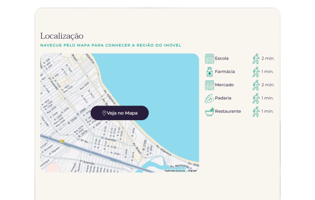 Na página do imóvel, o mapa da Keyspot mostra estabelecimentos próximos, como farmácias, escolas e mercados, com o tempo de deslocamento até eles. Integrado ao Google Places, facilita a exploração da conveniência e infraestrutura da região, proporcionando uma visão completa do entorno.